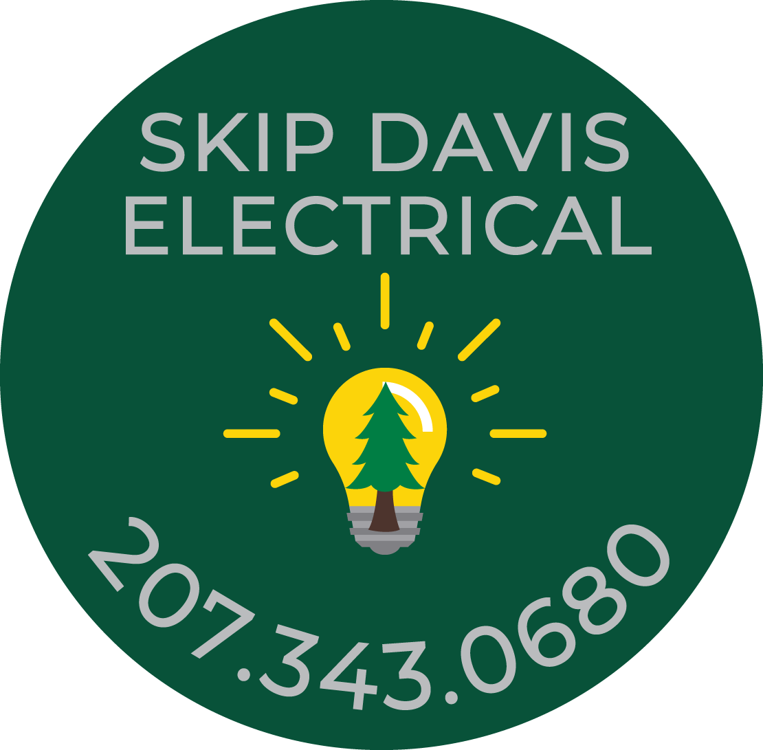 Circular logo with green background, gray text saying 'Skip Davis Electrical' and white text displaying the phone number '207.343.0680'; center features a yellow light bulb with a green pine tree inside, radiating yellow lines.